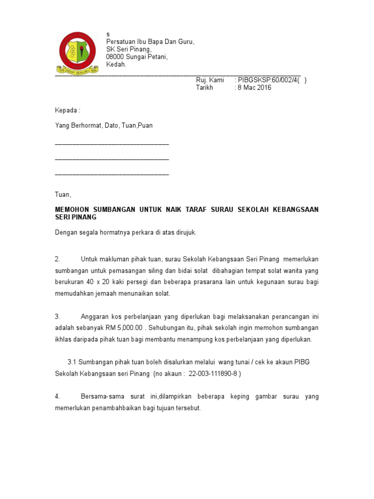 Contoh Surat Memohon Sumbangan Derma Pembangunan Surau Alfirdaus Taman Garing Utama Rawang Selangor