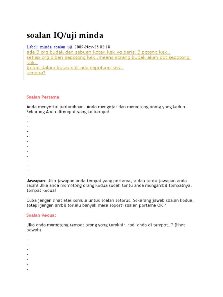 Uji minda contoh soalan iq test dan jawapan. Dieana february 25 2013 at 11 25 am. Soalan uji iq dan jawapan buku soalan uji iq dan jawapan kursus soalan uji iq dan jawapan epsa soalan uji iq dan jawapan parlimen soalan uji iq danish contoh soalan uji iq soalan uji iq matematik soalan uji minda iq soalan uji minda contoh soalan ujian medsi soalan ujian matematik tahun 1 soalan ujian kemasukan sekolah berasrama penuh soalan ujian pendidikan islam tingkatan 4. Kira 1000 dan tambah dengan 40. Ini jawapan sebenar soalan soalan di atas.